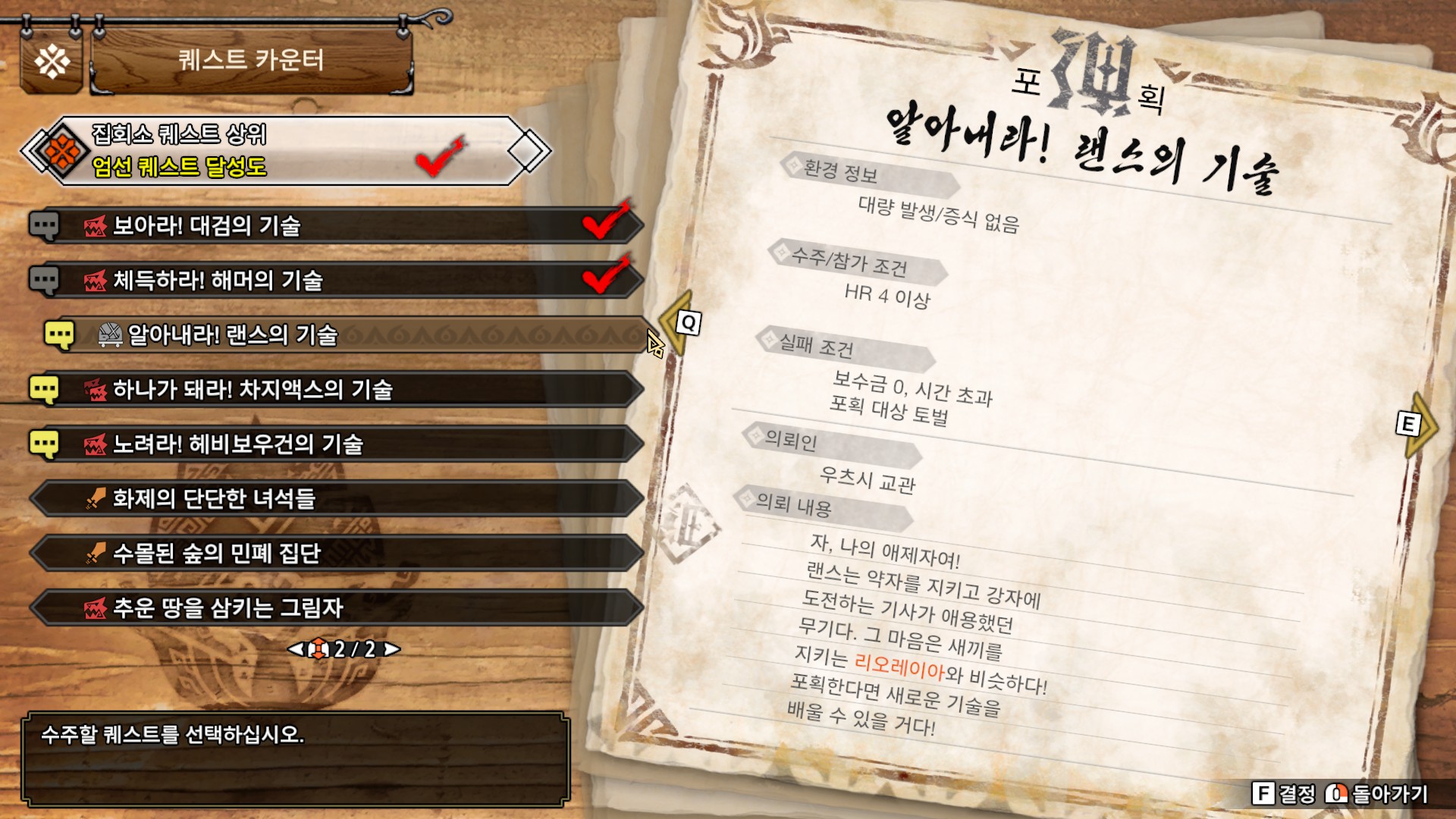 몬스터 : 용 조종이 나올 때도 있고 부위파괴가 나올 때도 있는데 대형 몬스터랑 싸우다 보면 대부분 달성 됩니다.
