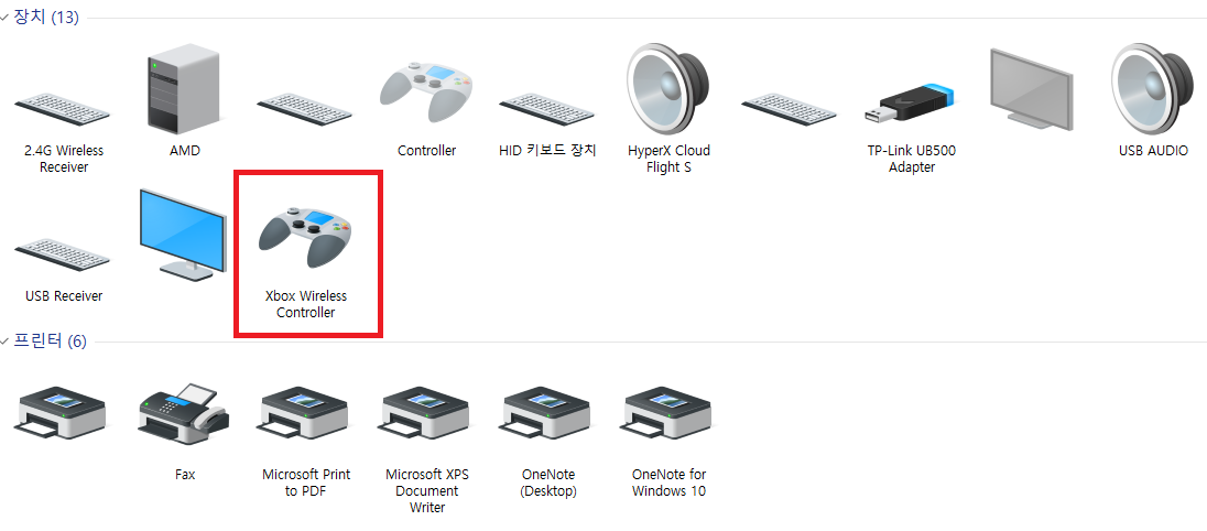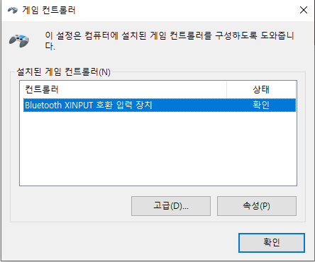 Bluetooth XINPUT 호환 입력 장치 또는 자신의 기기가 정상적으로 연결되어있다면 여기에 보이는 장치를 더블 클릭.