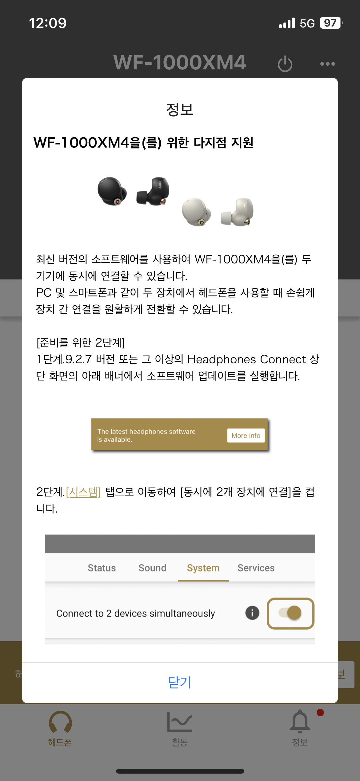 WH 1000XM4 헤드폰은 멀티포인트 멀티페어링 다 지원했는데 비슷한 시기에 출시된 WF-1000XM4 만 없는게 억울했고 받아 들였는데, 오랫만에 아이폰에 있는 SONY headphones 라는 앱을 켜보니 펌웨어가 있고 거기에 다지점 지원이라는 글이 있다.