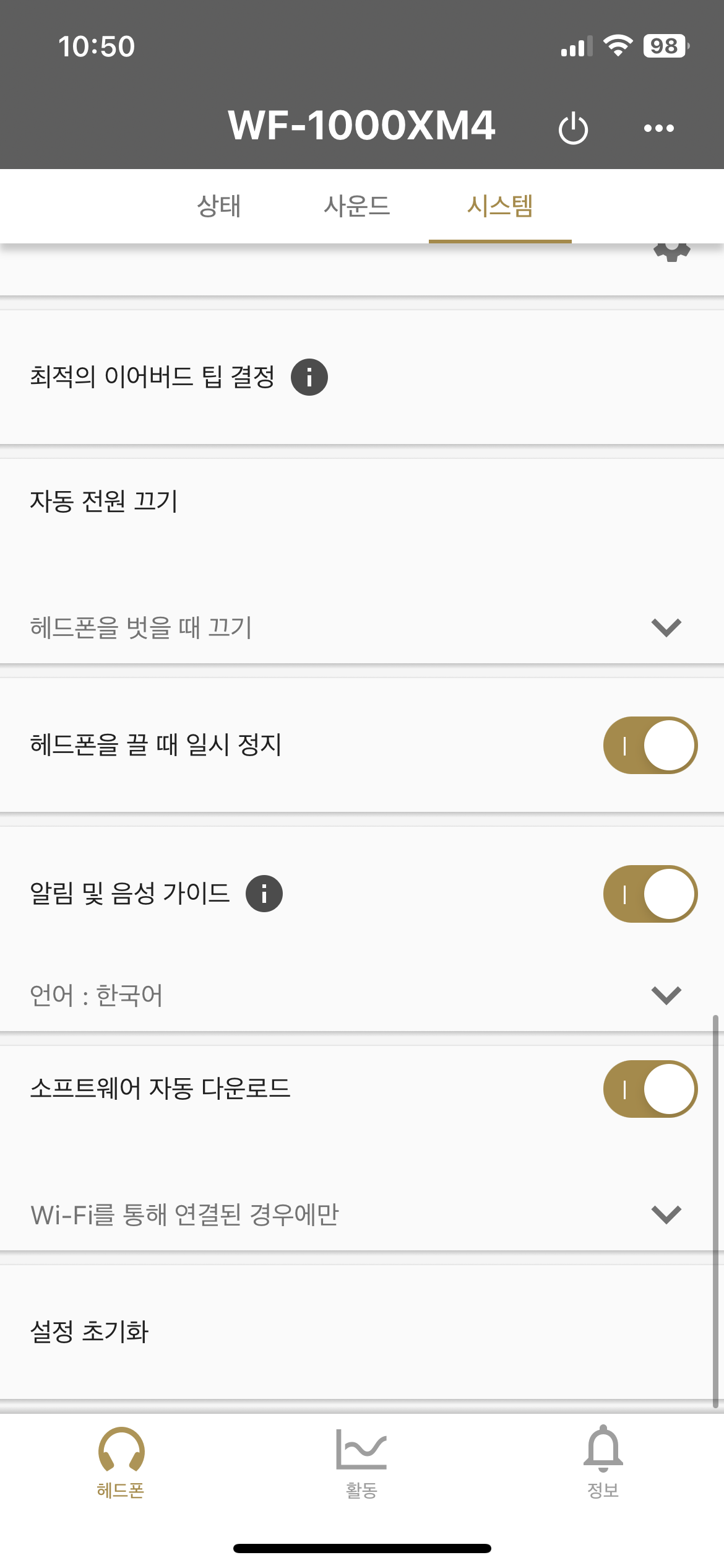 1 단계.9.2.7 버전 또는 그 이상의 Headphones Connect 상단 화면의 아래 배터에서 소프트웨어 업데이트를 실행합니다.