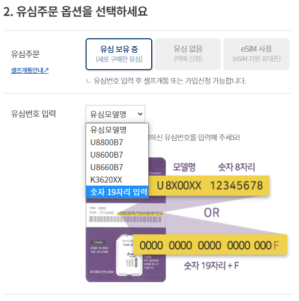 유심 옵션에서 보유중하면 이런 넘버를 입력해야 하는 듯.