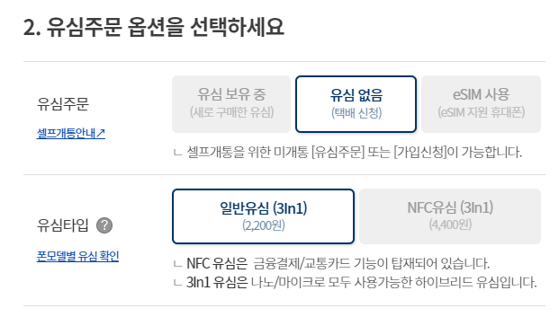 유심 없음을 경우 택배비 2200원이 청구된다. NFC 유심도 신청가능하고 4400원이다.