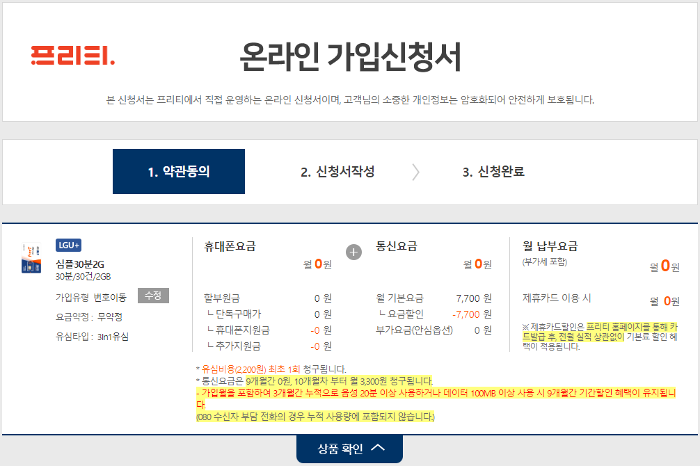 - 온라인몰에서만 가입 가능한 전용요금제이며, 프리티의 모든 요금제 기본료는 부가세가 포함된 금액입니다.