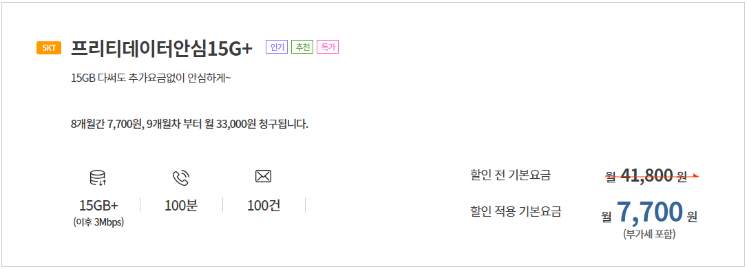 SKT 알뜰요금제 프리티데이터안심15G+ 요금제도 신청했다.