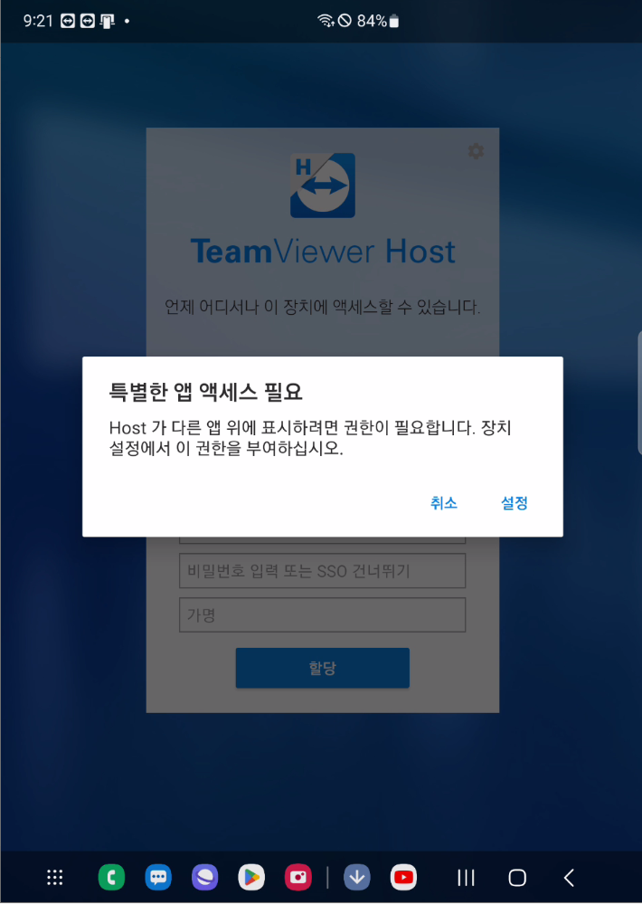 Host 가 다른 앱 위에 표시하려면 권한이 필요합니다. 장치 설정에서 이 권한을 부여하십시오.
