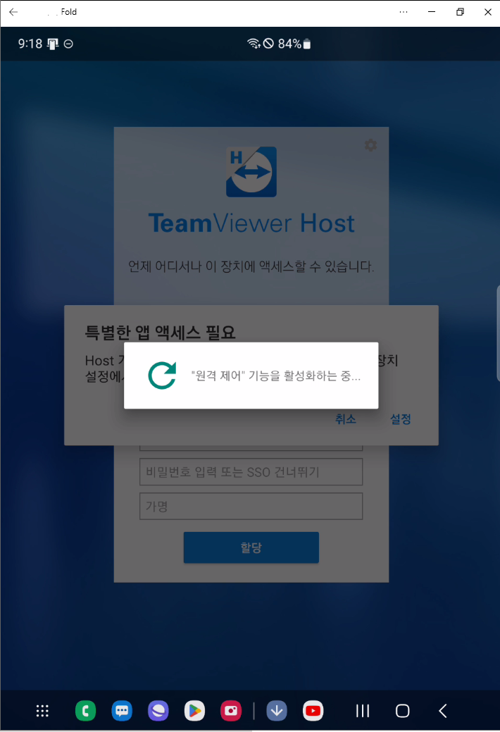 설치하고 실행하면 "원격 제어" 기능을 활성화하는 중... 이라는 메시지가 뜨는데 꽤 길게 뜬다.
