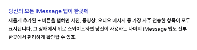 아이메시지가 개선되었다고 하는데 아이폰 끼리만 되는 기능이고 이미 메신져가 있는데 사용할 필요도 없는 앱이다. 스팸이 너무 많이 날라와서 사용하지 않는다.